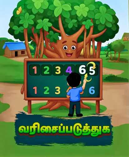 An illustration showing children riding a bullock cart through green Tamil fields, representing Playwithtamil’s cultural connection to Tamil heritage and learning.